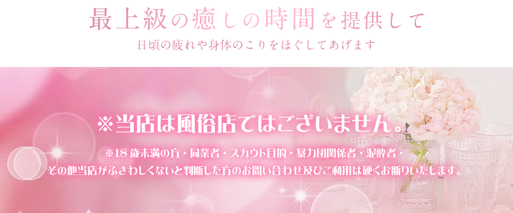 癒し系隠れ家エステ店が誕生いたしました。当店では癒し系のセラピストによる施術で皆様の疲れた身体を癒していきます。もちろんストレス解消が出来るよう配慮していますので、お気軽にご利用下さい。尚、お店は予約制になっておりますので、他のお客様と顔を合わせることなく、寛いで頂けます。お近くにお越しの際やお仕事の隙間時間、お仕事帰りなどお気軽にお立ち寄りください。皆様のお越しをスタッフ一同心よりお待ちしております。